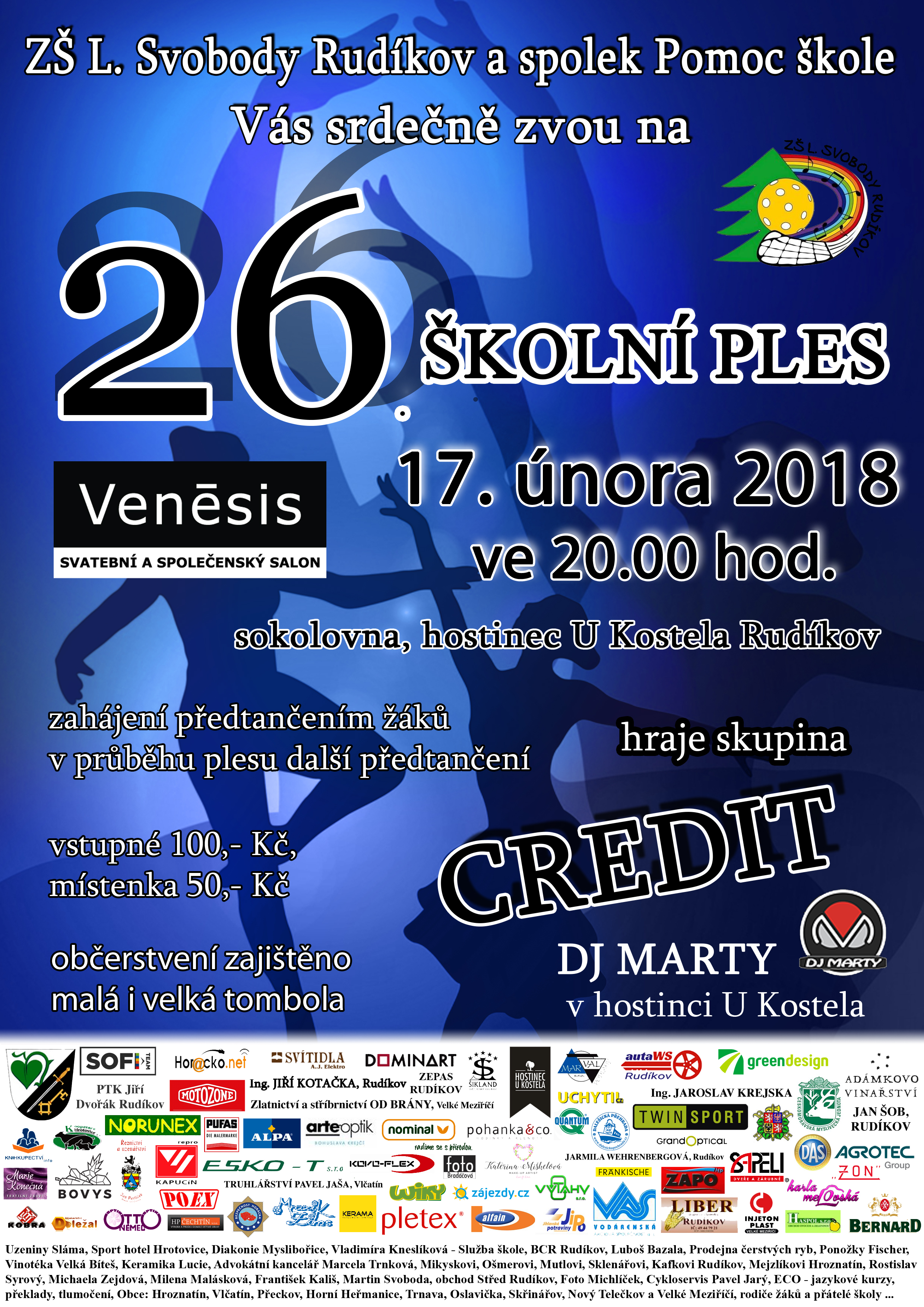 Předprodej místenek a vstupenek na 26. školní ples (sobota 17. 2. 2018 - sokolovna, hostinec U Kostela Rudíkov) bude pro sponzory plesu přednostně zahájen v pondělí 29. ledna, pro ostatní zájemce v pondělí 5. února.