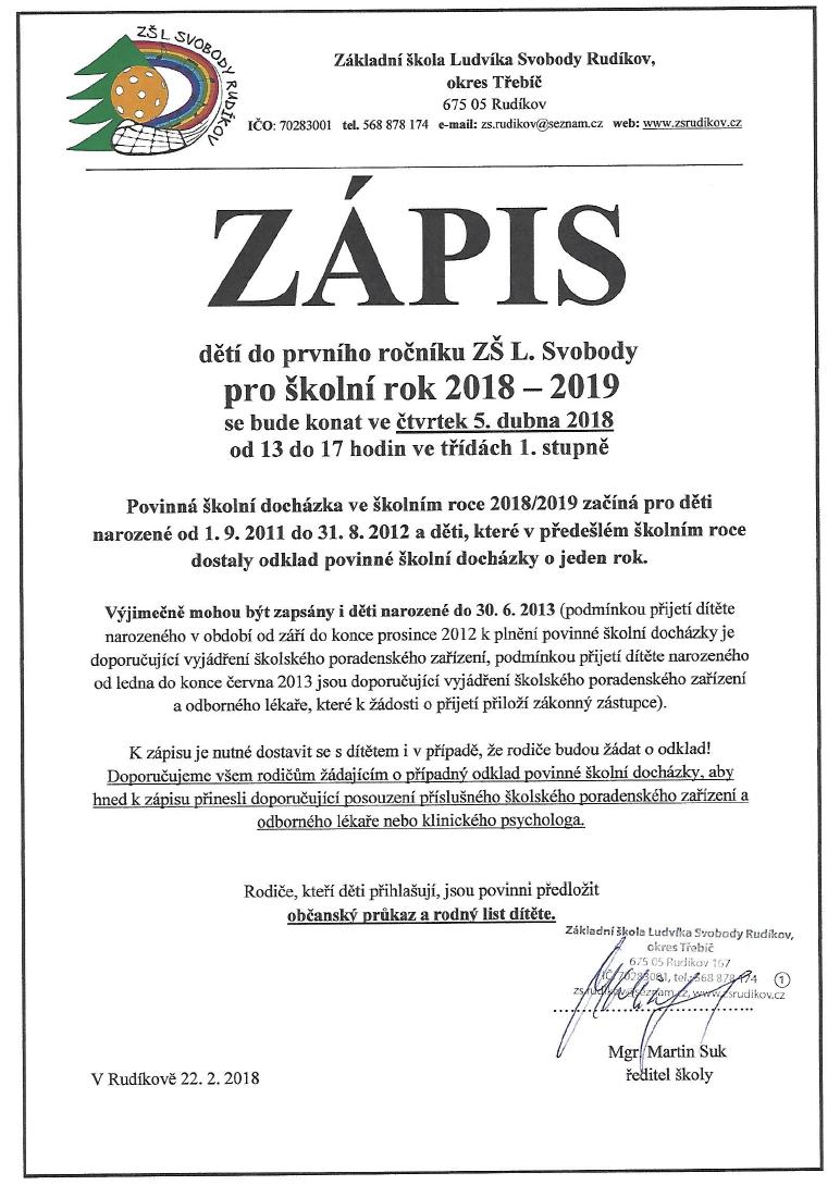 Oznamujeme žákům a rodičům, že zahájení nového školního roku 2018/2019 proběhne v pondělí 3. září 2018 v 7.20 hod.