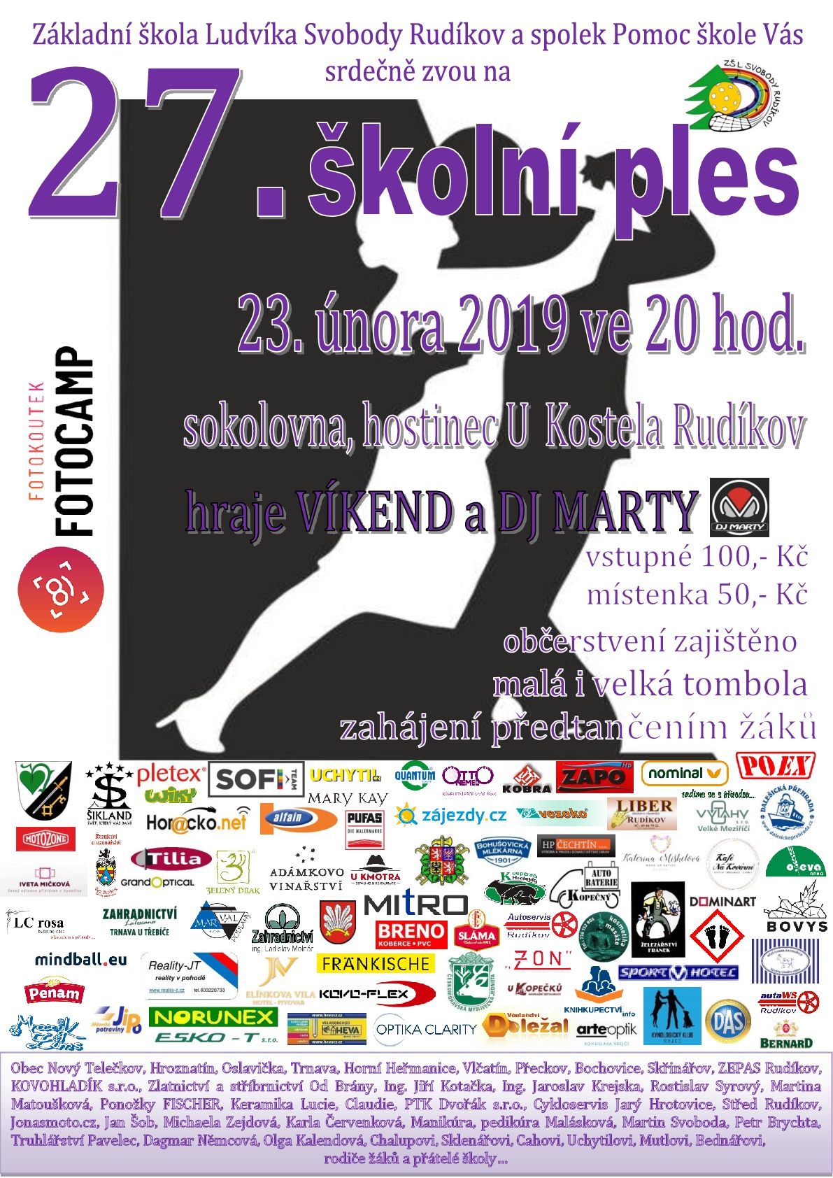 Základní škola Ludvíka Svobody a spolek Pomoc škole děkují všem sponzorům, kteří přispěli 469 cenami do malé tomboly a 41 cenami do velké tomboly 27. školního plesu, který proběhl v sobotu 23. 2. 2019 v rudíkovské sokolovně.