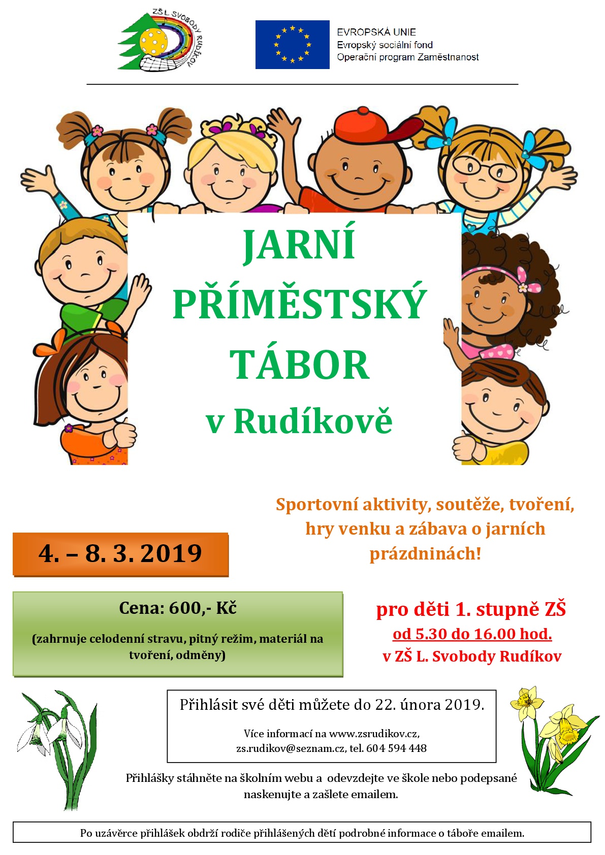 Spouštíme přihlašování na jarní příměstský tábor, který proběhne v naší škole o jarních prázdninách v termínu 4. - 8. března 2019.