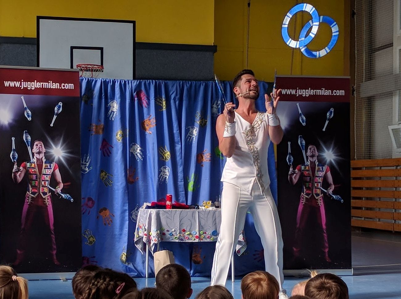 Děti 1. a 2. ročníku dostaly jako dárek ke Dni dětí žonglérské vystoupení Milana Ošmery.