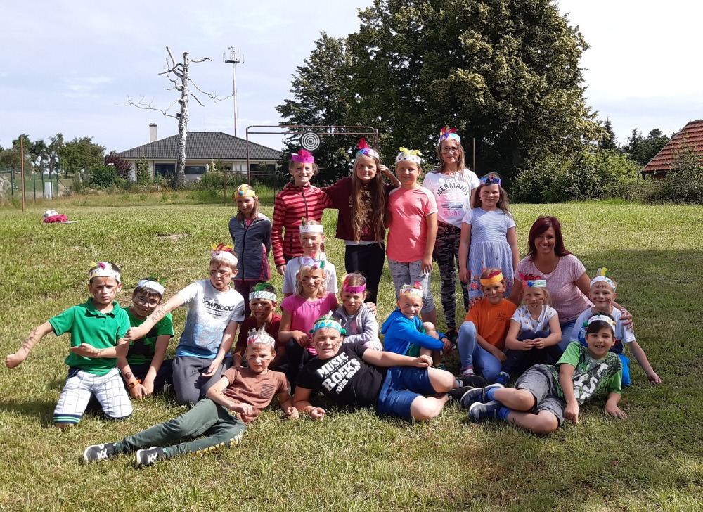 Náš první indiánský den jsme děti rozdělily do tří týmů (kmenů). Každý kmen si vymyslel název týmu, název své indiánské vesničky, symbol jejich kmene a přezdívku každého člena týmu. Toto všechno děti namalovaly na velký papír.