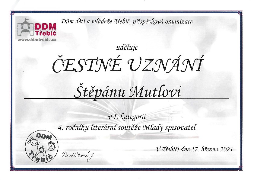 Žák 4. ročníku Štěpán Mutl se zúčastnil soutěže Mladý spisovatel, kterou již čtvrtým rokem organizuje Dům dětí a mládeže Třebíč. Letos z důvodu epidemiologické situace proběhla soutěž online.