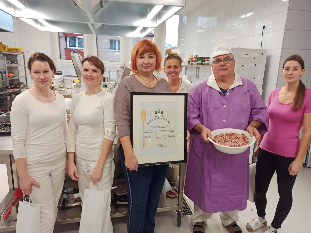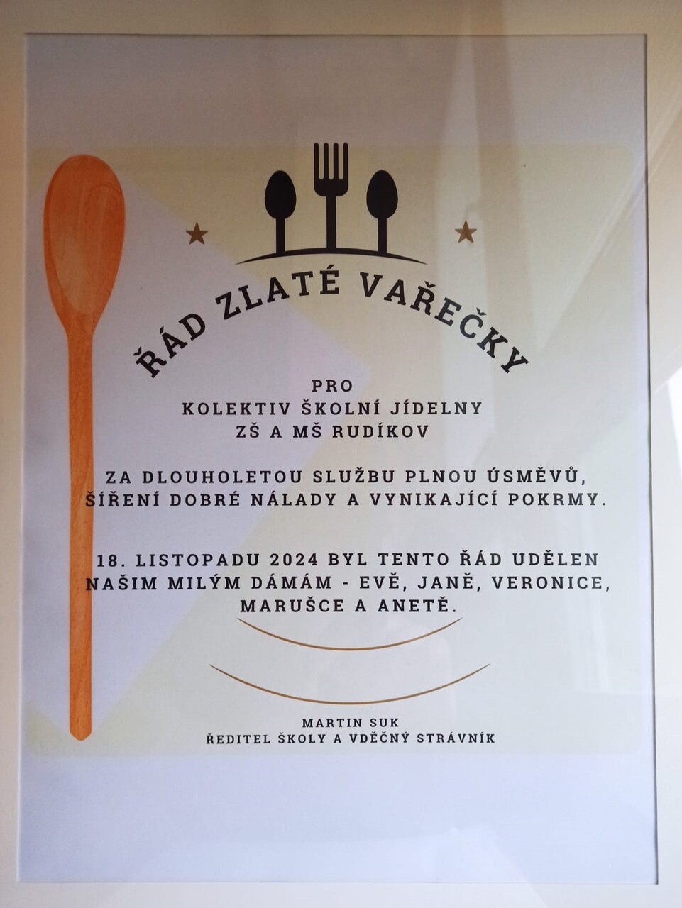 V rámci „Dne kuchařek a kuchařů“ projektu Hrdá škola jsme v pondělí 18.11. poděkovali našim kuchařkám ze školní jídelny za jejich práci. Z rukou vedení školy naše skvělé kuchařky obdržely drobné dárky a Řád zlaté vařečky za vše, co pro nás každý den dělají.