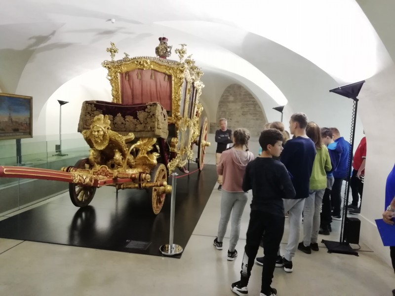 Tramvají jsme se přesunuli na první zastavení našeho putování, k bráně Arcidiecézního muzea Olomouc. Zde jsme se stali účastníky komentované prohlídky „Sklepem, sálem, podkrovím“, při níž nám pan lektor představil historii celého areálu a seznámil nás s některými osobnostmi světového významu, jež jsou s Olomoucí spjaty. Mohli jsme tak zavítat k místu, kde byl údajně zavražděn český král a poslední panovník z rodu Přemyslovců Václav III., nebo si důkladně prohlédnout barokní kočár olomouckého biskupa Ferdinanda Julia Troyera, či hmatem rozeznat rozdíl mezi gotickými a románskými okny.