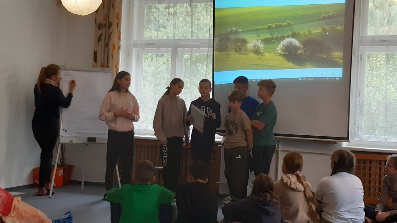 Náš ekologický program se jmenoval Klima v krajině. Zamysleli jsme se nad naším šetrným chováním, vymodelovali jsme podle mapy krajinu, která je postižená změnou klimatu. Součástí programu byl i pohyb po zahradě a hledání příčin a řešení problémů. Na závěrečné konferenci si skupinky žáků své poznatky navzájem prezentovaly a diskutovaly o nich.