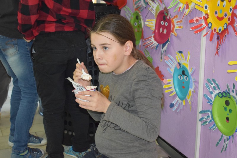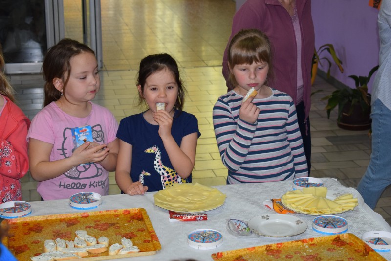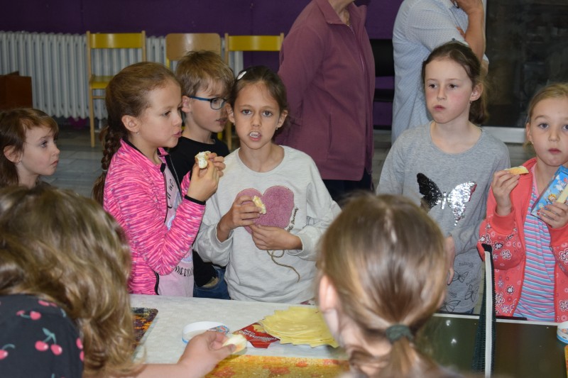 Proto se v úterý 16. dubna o velké přestávce shromáždili všichni žáci naší školy ve vestibulu, kde proběhla hromadná ochutnávka těchto výrobků. A že smlsnout si bylo na čem! Stoly se prohýbaly pod pečivem namazaným tavenými sýry a pomazánkami, které nám z tvarohu připravily paní kuchařky z naší školní jídelny. Děti si také mohly vybrat z několika druhů sýrů, ochucených i neochucených mlíček, jogurtů apod., takže každý jedlík si přišel na své.