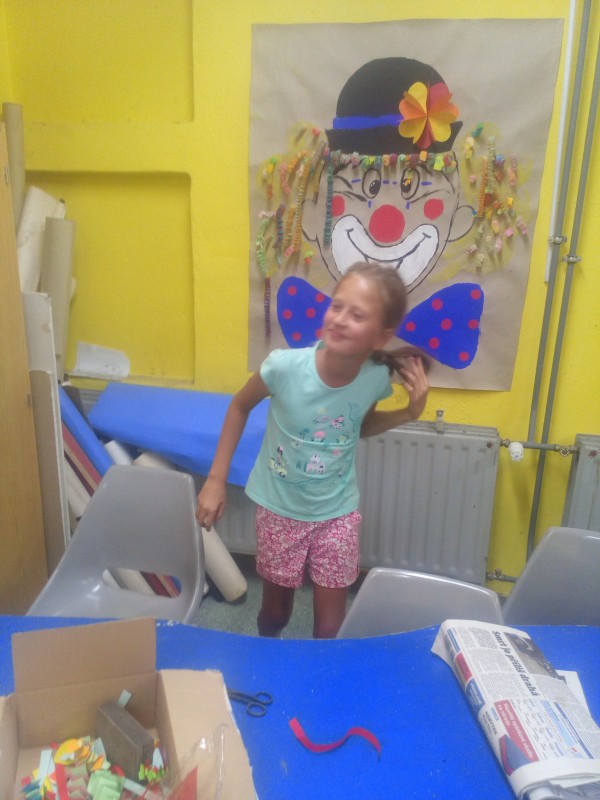 Poslední den tohoto týdne jsme se věnovali výrobě společné práce, kde tématem byl šašek. Děti si ho vyzdobily papírovými vlasy. Další činností byla výroba zápichů s tématem pohádkových bytostí. Po obědě jsme dokončili výrobky, čekal nás znalostní kvíz ( vyhlášení vítěze, odměny). Následovalo rozdání keramiky a odměn pro děti. Společně jsme se rozloučili a dětem popřáli šťastný vstup do nového školního roku.
