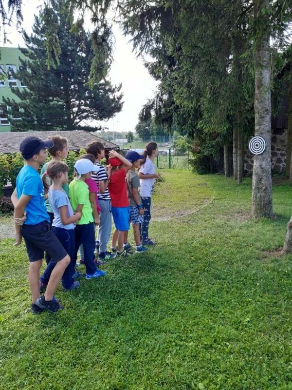V úterý ráno se všechny děti seznámily se základy moderní kaligrafie, pomocí brushpenů se naučily základní tahy i práci s tímto písmem. Pomocí markeru na keramiku jsme ozdobili hrnečky pro své blízké. V tělocvičně jsme si zahráli hru "Rybičky lovte se" a florbal. Vyzkoušeli jsme si lezení po tyči i laně. Po výtečném obědě jsme pletli košíčky z papírových ruliček a dokončovali hrnečky. Na hřišti u školy jsme stříleli z luku šípem na terč, házeli šipky a vystřídali se u zalévání vyvýšených záhonů.