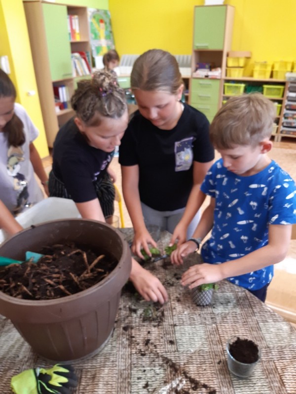 První srpnový týden se nesl v duchu domácích mazlíčků. Hned v pondělí jsme si děti otestovaly na nemoc COVID 19 a nic nám nebránilo se pustit do různých aktivit. Po svačině jsme si do skleněného květináčku zasázeli netřesky a malovali na kamínky fixami své domácí mazlíčky. Vyřádit jsme se šli do tělocvičny, kde si děti zahrály florbal, lezly po laně, skákaly ze švédské bedny a využily gymnastické míče. Po výborném obědě v hostinci U Kostela jsme si odpočinuli u deskových her a pletení košíčků z papírových ruliček. Krásné počasí nás vylákalo na multifunkční hřiště za školu, kde jsme si zahráli vybíjenou, skákali do písku a házeli míčem na koš. Také jsme zalili vyvýšené záhony.
