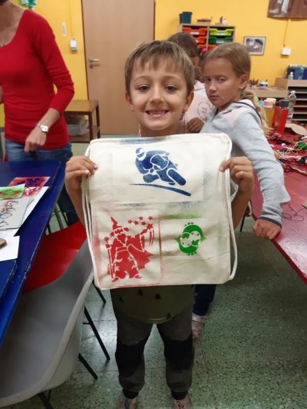 Během ranního scházení si prozatím děti mohly malovat, pak jsme se všichni seznámili a pověděli si, co nás celý týden čeká a co budeme tvořit. Hned po svačině jsme se rozdělili do dvou skupin. Jedna skupina si vyrobila náramky z mulinky a druhá skupinka si vybrala šablony na výrobu látkového batohu.
