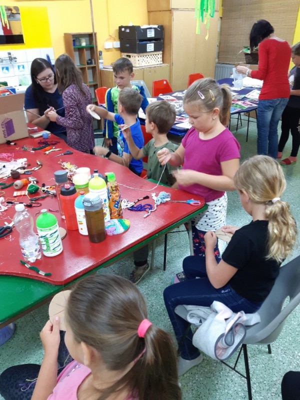 Po výtečném obědě jsme si odpočinuli u pletení náramků v altánu na dvoře školy. Některé děti si pohrály na prolézačkách, jiné si zastřílely z luku s šípy. Odpoledne jsme trávili před školou, stříleli z luku s šípy, hráli si na prolézačkách, houpali se na houpačce, pletli náramky z mulinky.