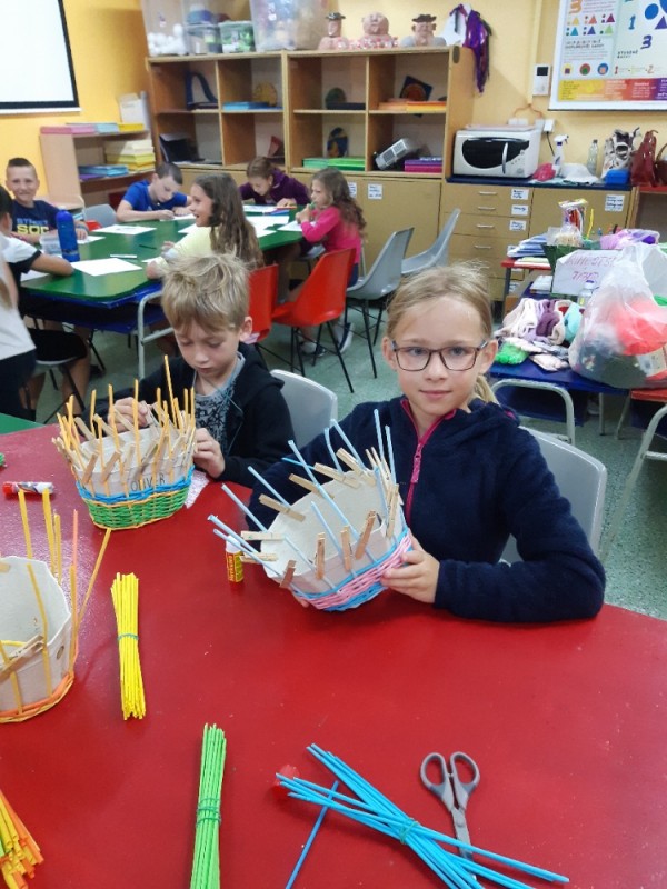 V úterý ráno děti pletly košíčky z papírových ruliček, dodělávaly strašidýlka z ponožek. Po svačině jsme dokončili obrázky s vodní tématikou pomocí akrylových barev a pustili se do výroby masky žáby z papíru a dozdobili je krepovým papírem. Venku jsme si zasoutěžili v maskách, kluci proti holkám při praní utěrek na valše na čas. Náramně se přitom nasmáli. Po výtečném obědě si děti pletly košíčky, zahrály si karty. Odpoledne jsme trávili čas na hřišti házením šipek na terč, střílením z luku s šípy a hrou na schovávanou.