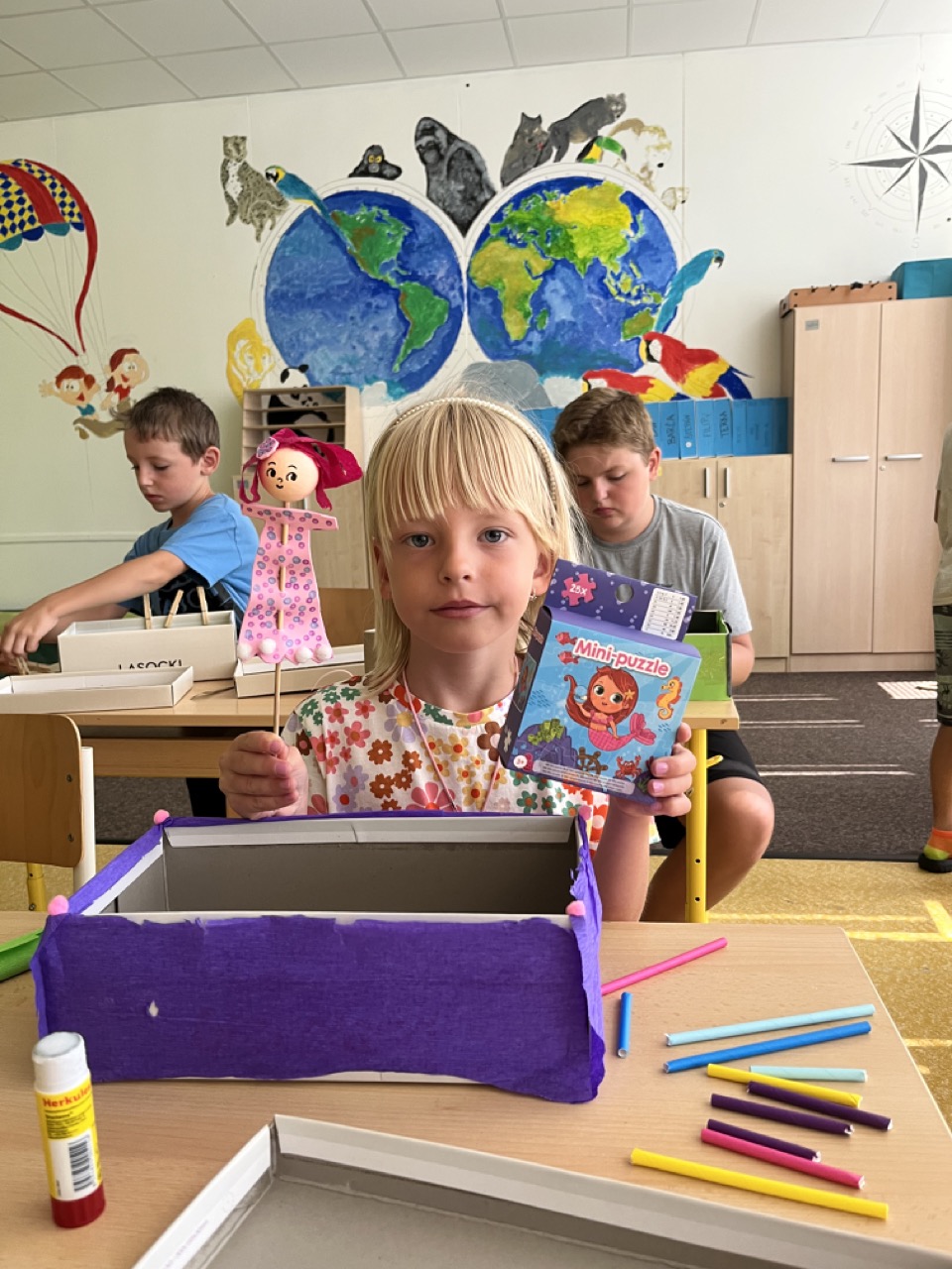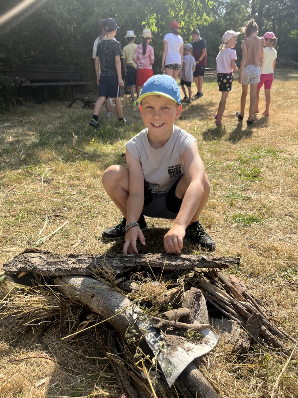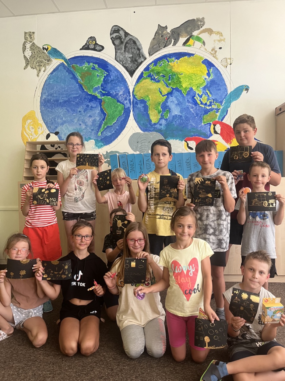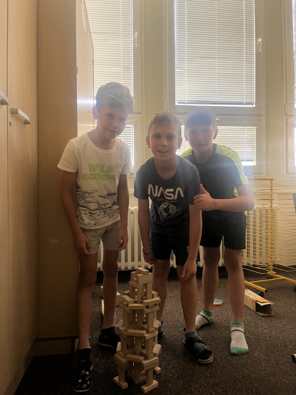 Na zbytek dopoledne jsme se přesunuli do tělocvičny, kde se konaly různé sportovní soutěže v týmech. Jelikož jsme se rozhodly se na táboře zaměřit spíše na vyrábění a rozvíjet kreativitu dětí, nesměly výrobky chybět již první den po obědě. Děti si namalovaly strom osobnosti, který pak jiné děti poslední den doplnily o hezké popisky vystihující vlastnosti daného člověka. Dalším výtvorem byl 3D krab, který se dětem velmi povedl.