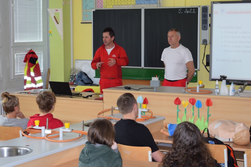 V pátek 6. května 2022 byli žáci zkušenými záchranáři a hasiči proškoleni o zásadách první pomoci a protipožární ochrany.