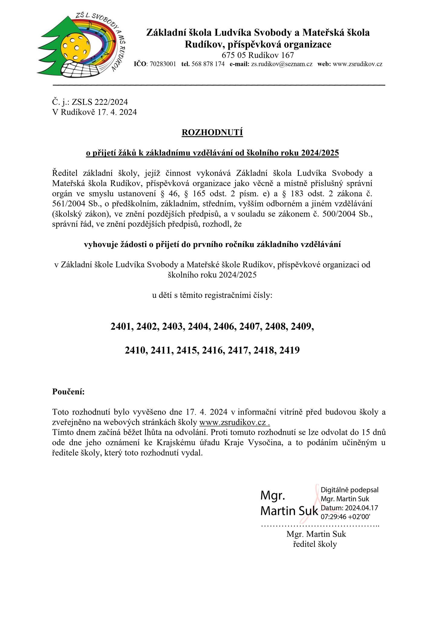 Základní škola Ludvíka Svobody a Mateřská škola Rudíkov, příspěvková organizace » Základní škola » Aktuality » 2023-2024 » Rozhodnutí o přijetí do 1. ročníku - školní rok 2024/2025